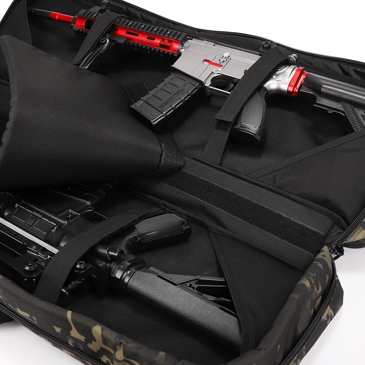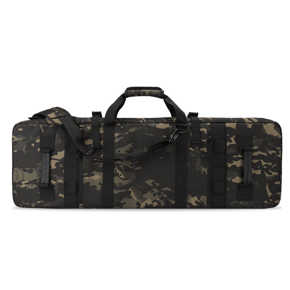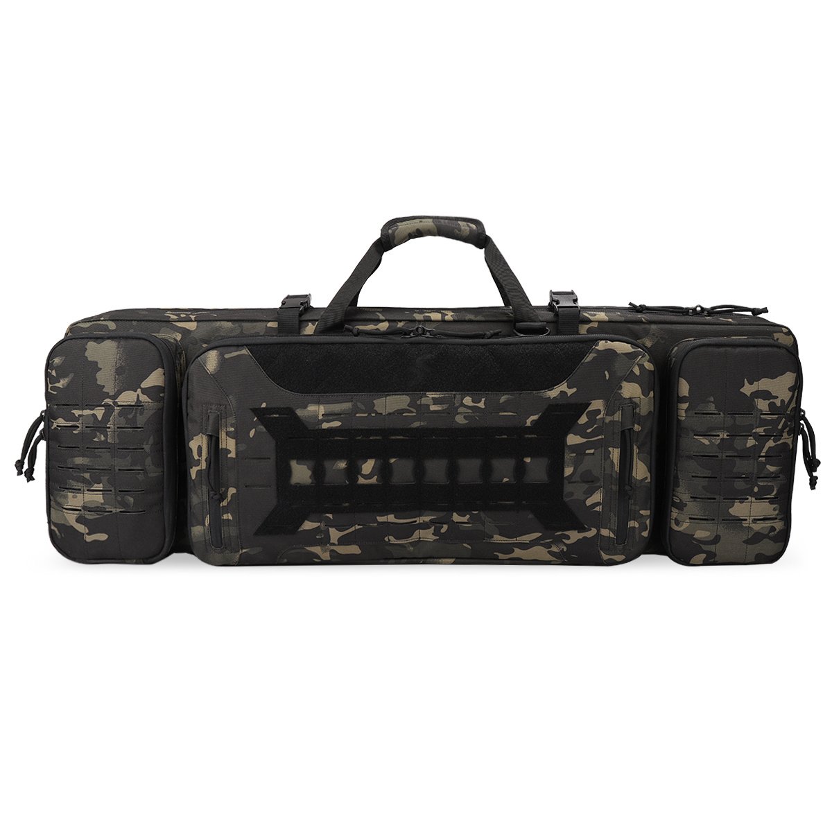 Durable Construction Material: Constructed by heavy-duty 600D nylon fabric exterior & interior. Padded on all side for increased protection. Removable protective pad keep your valuable firearm from wear also can be used as shooting mat.Safe & Spacious: Dual lockable zippers keep your firearms safe; 2 locks included in the package. Holds 2 rifles and 2 pistols; ample storage in the front for your range accessories. Molle compatible webbing for customization.Professional Rifle Bag: Rugged ballistic pack cloth construction; extra 2 outside accessory pouches fit all your need. Portable removable backpack w/storage pouches. Double stitching construction workmanship solid.Hold 2 RifleRefined Design & Functional: Double rifle case with more refined design; multiple compartments inside and out provide storage for just about anything you’ll want to carry. Fully customizable web and loop platform can carry all your other tactical accessories.